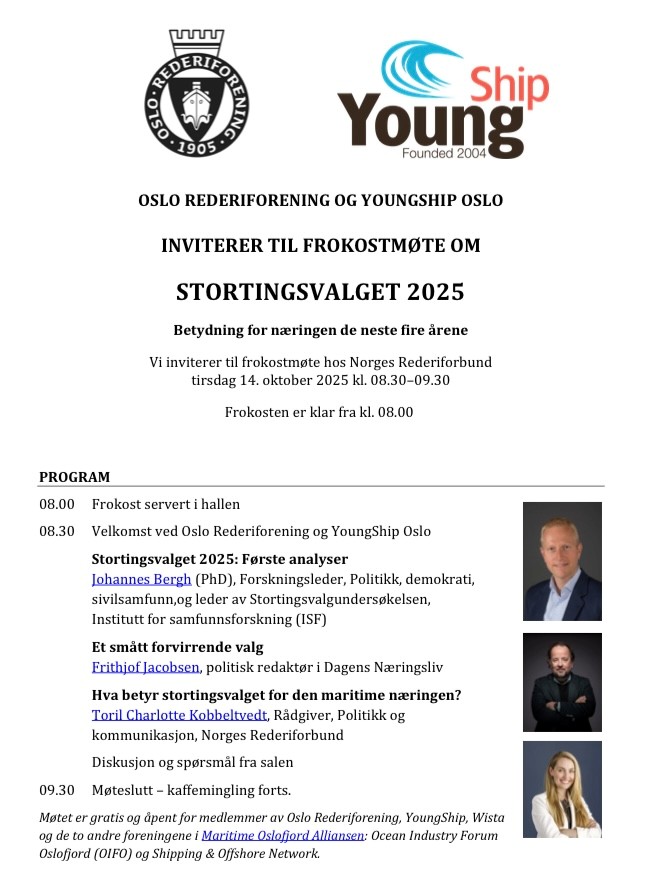 Oslo Rederiforening og Youngship Oslo inviterer til frokostmøte.