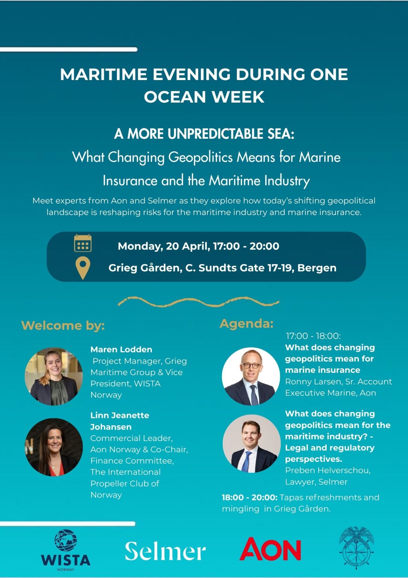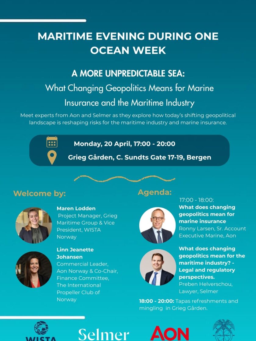 Aon, WISTA Norway and The International Propeller Club of Norway are pleased to invite you to a maritime evening during One Ocean Week in Bergen.